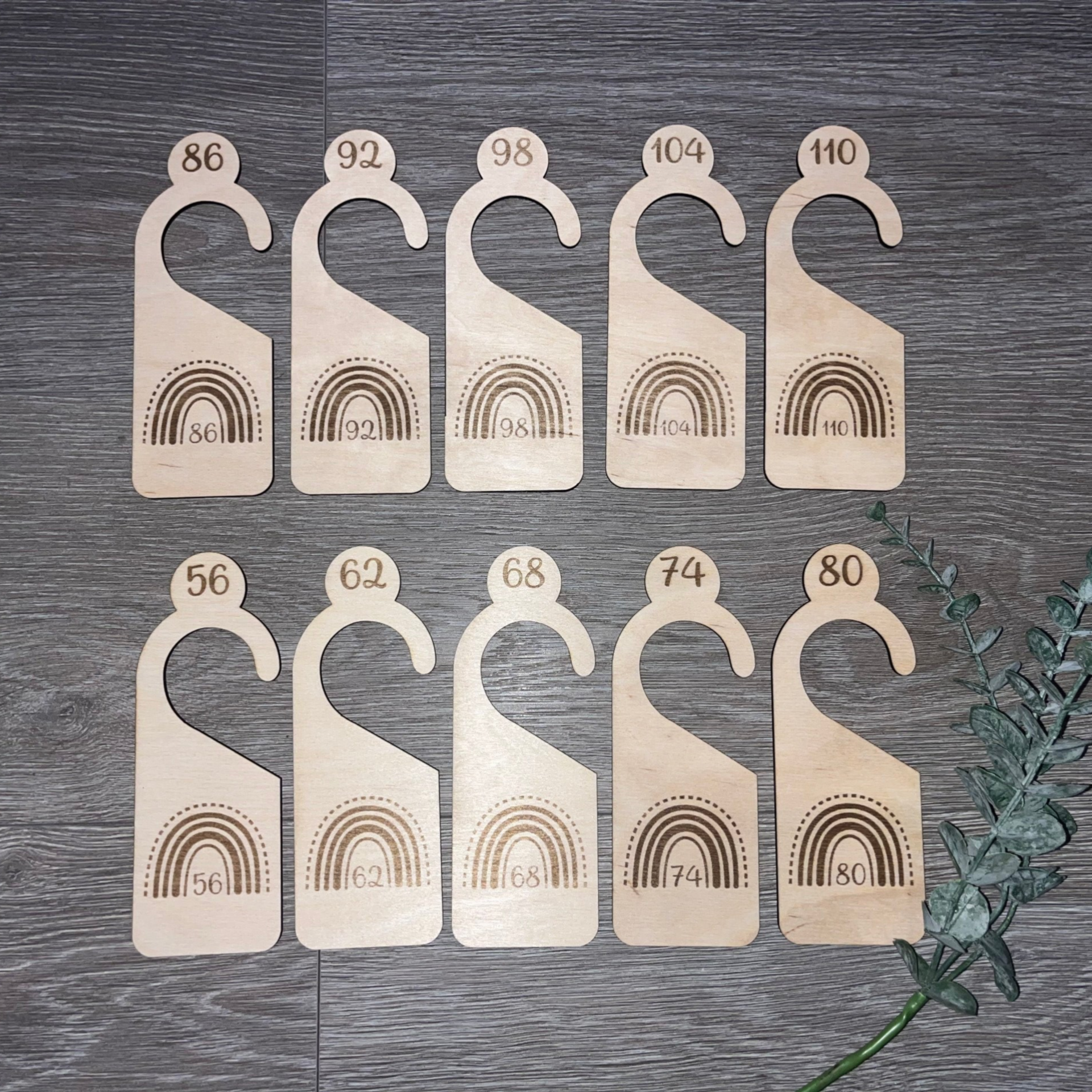 Das Set beinhaltet 10 Trenner die beidseitig mit folgenden Kleidergrößen und einem süßen Regenbogen graviert sind: