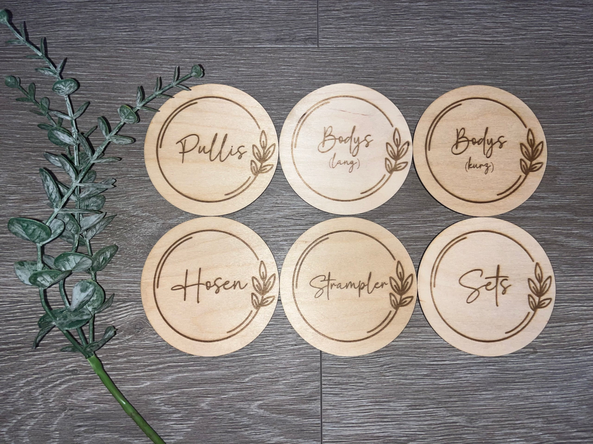 Die süßen Holzscheiben, hergestellt aus 3mm Birkenholz, sind perfekt geeignet um Boxen oder Schubladen zu beschriften.